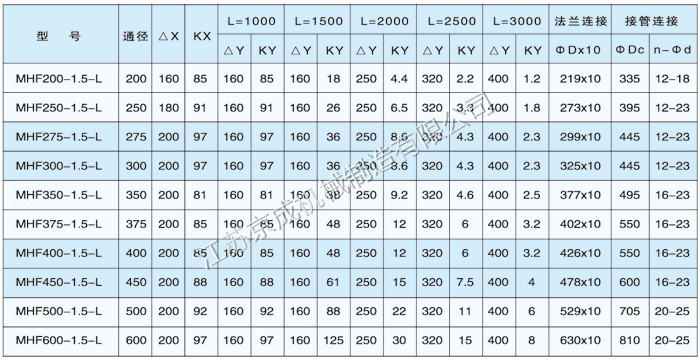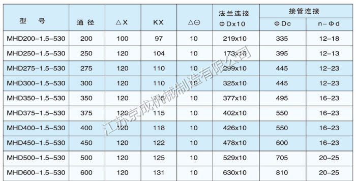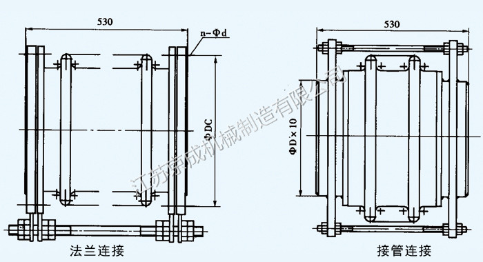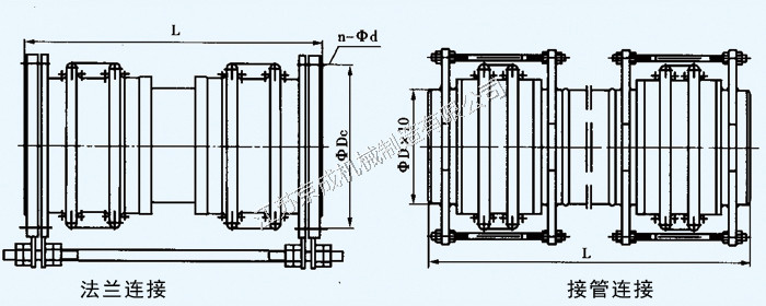 2、表中符號(hào)代表和技術(shù)參數(shù):△X:軸向補(bǔ)償量(mm); △θ:角向補(bǔ)償量(度); △Y:橫向補(bǔ)償量(mm);KX:軸向剛度(N/mm); Ky:橫向剛度(N/mm); L:產(chǎn)品總長(zhǎng)(mm);ΦDx10:接管外徑x接管厚度(表中mm),產(chǎn)品為接管連接;ΦDc:連接孔分布的中心圓直徑; n-Φd:n為連接孔數(shù),Φd為連接孔徑,產(chǎn)品為法蘭連接;